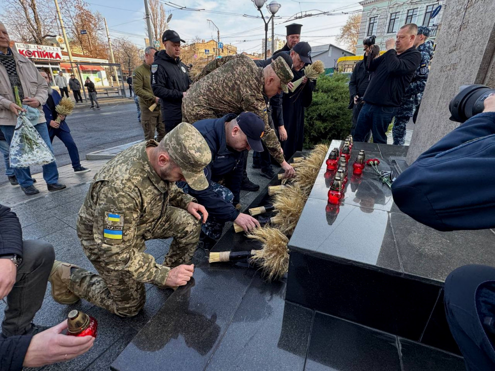 In Odesa, a solemn ceremony took place on Hetman Sahaidachny Boulevard where flowers were laid at the memorial for the victims of the Holodomor in Ukraine, marking the somber anniversary.