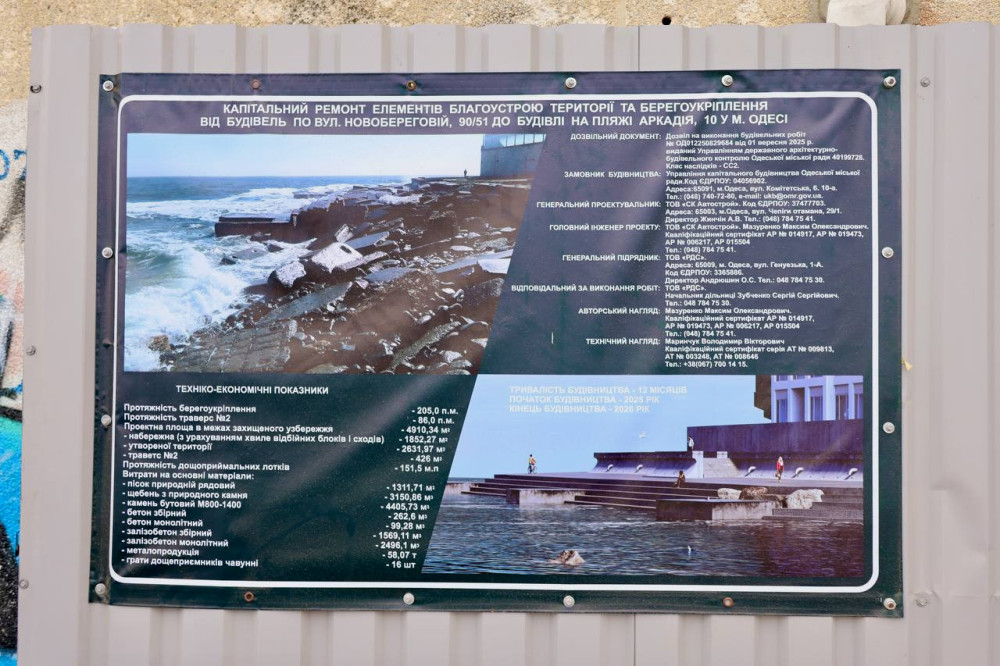 Параллельно ведется укрепление берега на участке побережья от Аркадии до улицы Новобережной. Эти работы направлены на защиту берега от разрушительных волн, которые во время штормов подмывают грунт, в результате чего берег буквально «уходит» в море.