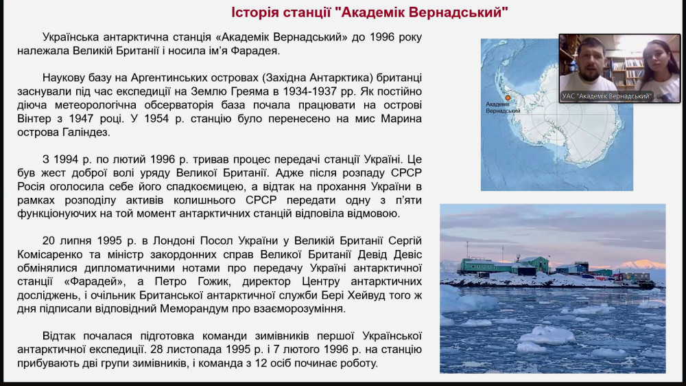 Ученики Одесского лицея №56 встретились онлайн через Zoom с биологами, работающими на украинской антарктической станции «Академик Vernadsky». Эта встреча открыла для детей новые горизонты в науке и позволила узнать о жизни на ледяном континенте. По информации Одесского 56 лицея, на встрече присутствовали участники 30-й Украинской антарктической экспедиции. На связь вышли биолог Елизавета Сафонова, родом из нашего города, и ее коллега-болог Тарас Перетятко.