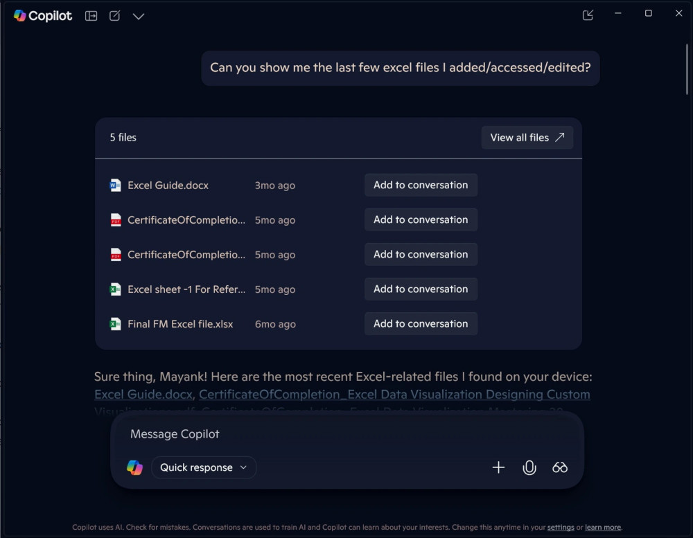 Microsoft представила нову функцію в Copilot для Windows 11 і Windows 10, що дозволяє використовувати штучний інтелект для пошуку файлів, які зберігаються на комп'ютері або в OneDrive. Раніше ця можливість була доступна лише учасникам програми Windows Insider, але тепер вона стала доступною всім користувачам Copilot, згідно з інформацією від Windows Latest.